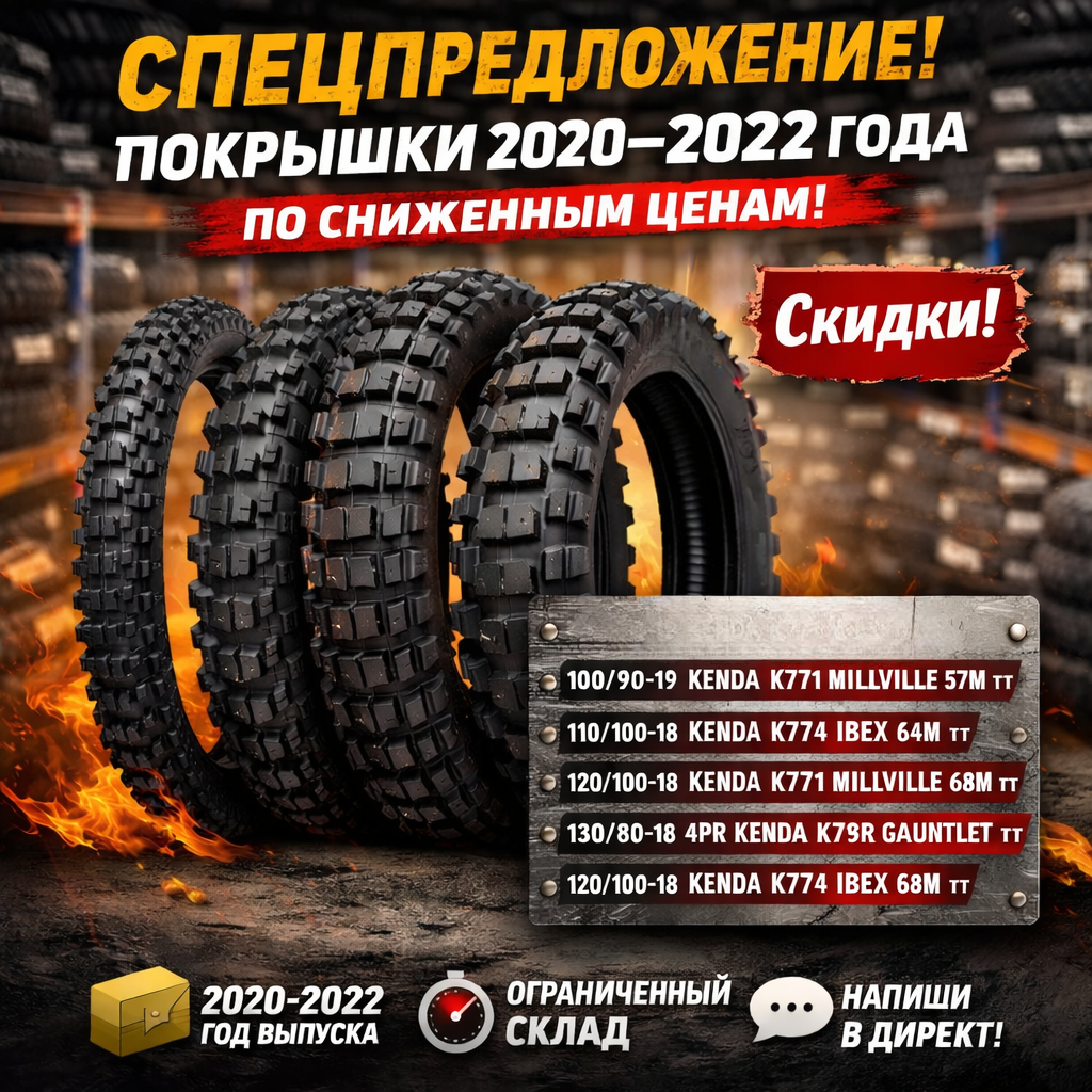 Спецпредложение на мото-покрышки 2020–2022 года выпускаНа складские остатки покрышек 2020–2022 года выпуска сейчас действует специальное предложение